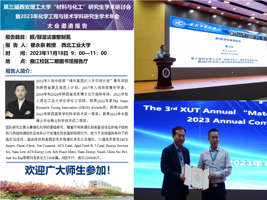 第三届williamhill英国官网“材料与化工”研究生学术研讨会暨2023年化学工程与技术学科研究生学术年会于2023年11月18日在williamhill英国官网曲江校区隆重举行。应化学工程与技术学科邀请,西北工业大学瞿永泉教授在公司曲江校区二期图书馆报告厅为参会师生作了主题为“醛/醇湿法重整制氢”的大会报告。