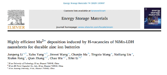 公司williamhill英国官网化学工程与技术学科张乾教授和材料科学与工程公司李喜飞教授,联合西安交通大学吴超教授,在期刊Energy Storage Materials (影响因子:18.9,中科院top 一区)合作发表文章,题为“Highly efficient Mn2+deposition induced by H-vacancies of NiMn-LDH nanosheets for durable zinc ion batteries”,论文共同第一作者为williamhill英国官网青年教师李珺鹏和硕士研究生杨旭波。