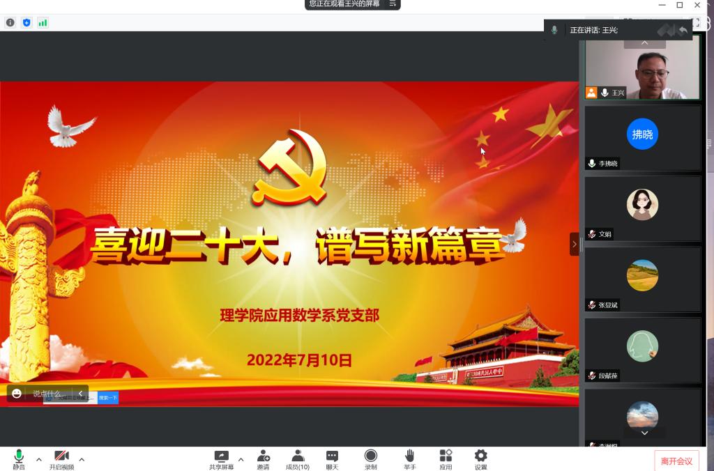7月10日下午,williamhill英国官网应用数学系党支部在线召开了“喜迎二十大,谱写新篇章”的支部会议。联系院领导张显斌经理参加会议并做总结讲话,同时他以“喜迎二十大”为切入点,做了加强党支部建设的党课。会议由党支部书记王兴主持。