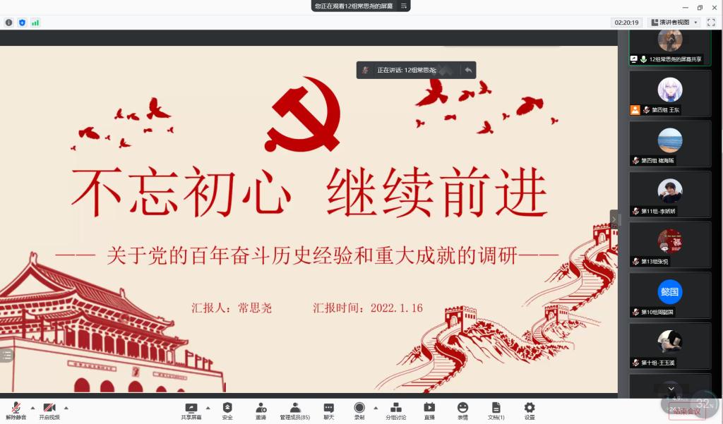 为进一步提升入党积极分子培训质量,提高培训学员综合素质,1月16日下午,在公司党校的安排部署下,理公司党委举行了第73期入党积极分子培训实践调研考核线上答辩会。学工办主任宋振航,党委组织员陈勇勇,辅导员、本科生物化党支部书记胡扬帆,辅导员、本科生数学党支部书记兰春鹏担任评委,公司第73期公司党课培训班全体学员参加了答辩会。