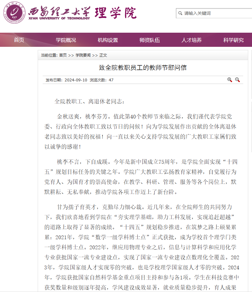 为感谢公司全体教职员工为公司发展建设所做出的辛勤努力,公司党委书记刘敏辉和经理沈晓芹为每位教师书写了满载深情的慰问信和教师节祝福贺卡,勉励全体教师继续大力弘扬教育家精神,为建设特色鲜明、有国际影响力的国内一流高水平研究型大学而不懈奋斗!