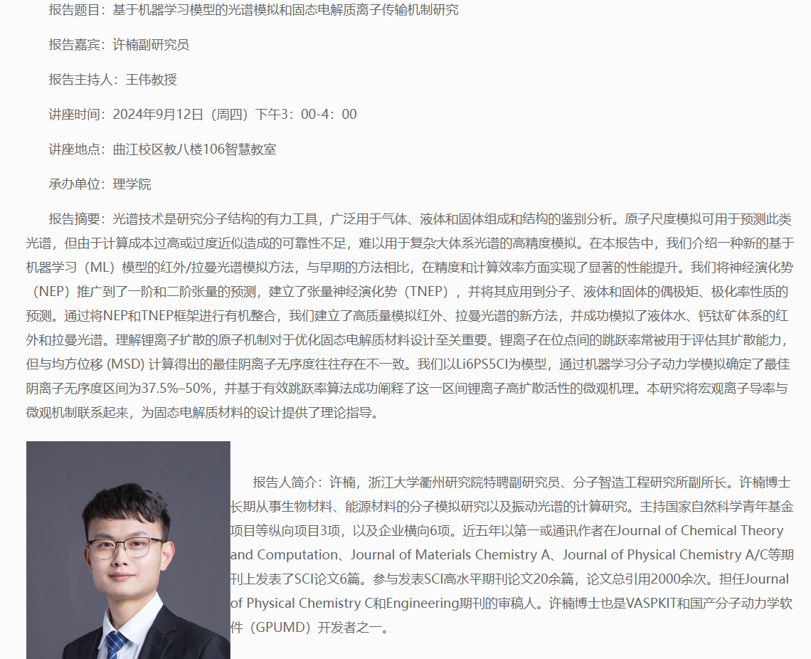 教师节前后,公司邀请西安交通大学张磊教授、陕西师范大学唐三一教授、浙江大学许楠副研究员和北京理工大学唐刚副教授来公司分别作《医疗大数据、医学人工智能和卫生经济学评价》、《药理毒理效应的普适性模型与数据分析》、《基于机器学习模型的光谱模拟和固态电解质离子传输机制研究》和《反钙钛矿型光电半导体材料的理论设计》的学术报告,不断开展学术交流,持续营造教职工学术氛围感。