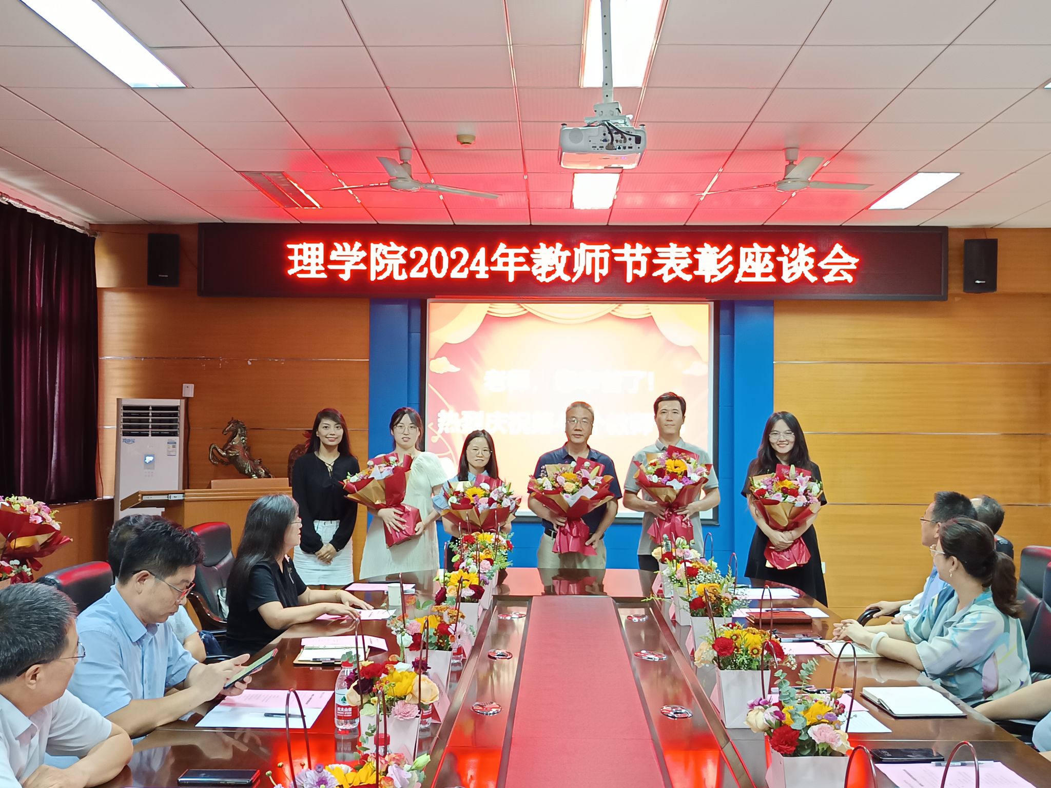 座谈会特别邀请了曾在公司工作过的领导和老师,院班子全体成员、退休教师、受表彰教师代表、院办主任、党委组织员、各系主任和新入职教师参加了会议。