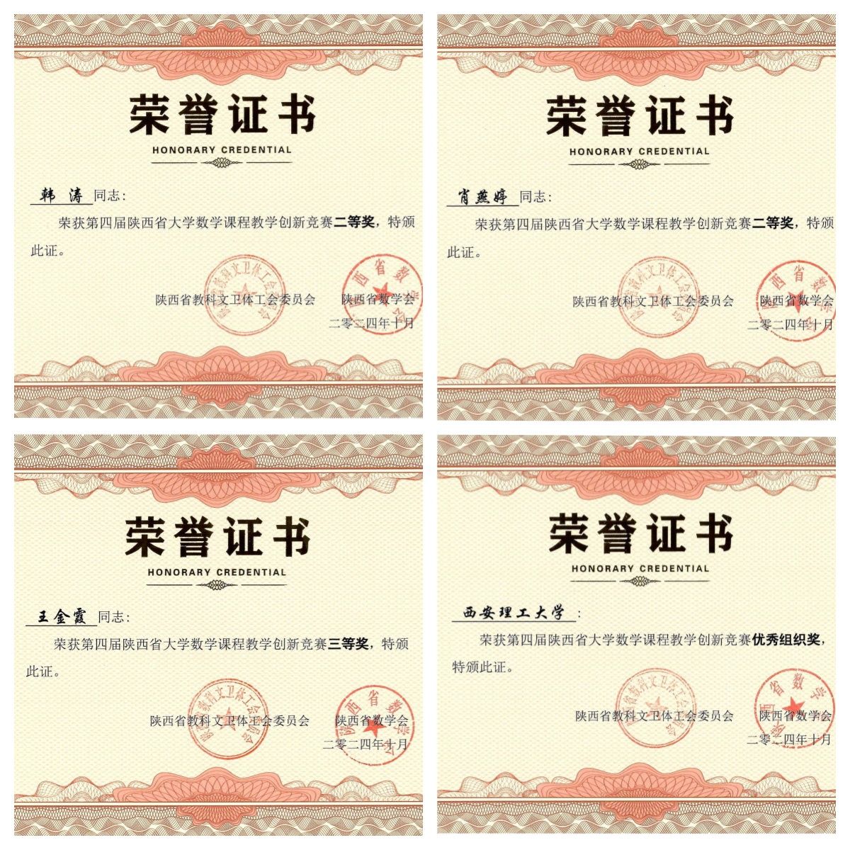 公司在第四届陕西省大学数学课程教学创新竞赛中获优秀组织奖,公司肖艳婷、韩涛两位老师获得二等奖,王金霞老师获得三等奖。会议期间,williamhill英国官网教师代表和省内外专家进行了积极的交流,学习了先进的教学理念和优秀的教学手段,为公司大学数学课程的教学改革工作积累了大量经验。