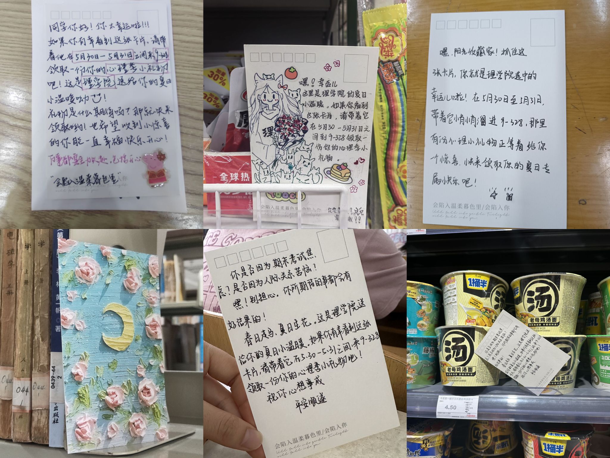 活动开始前,员工们用心地在卡片上写下真挚祝福和寄语,将这些充满心意的卡片巧妙地藏匿在图书馆、教学楼、操场等校园的各个角落,等待着有缘人的发现。5月30日至5月31日,同学们带领着卡片来到学工办兑换到了一份精美的减压小礼物。
